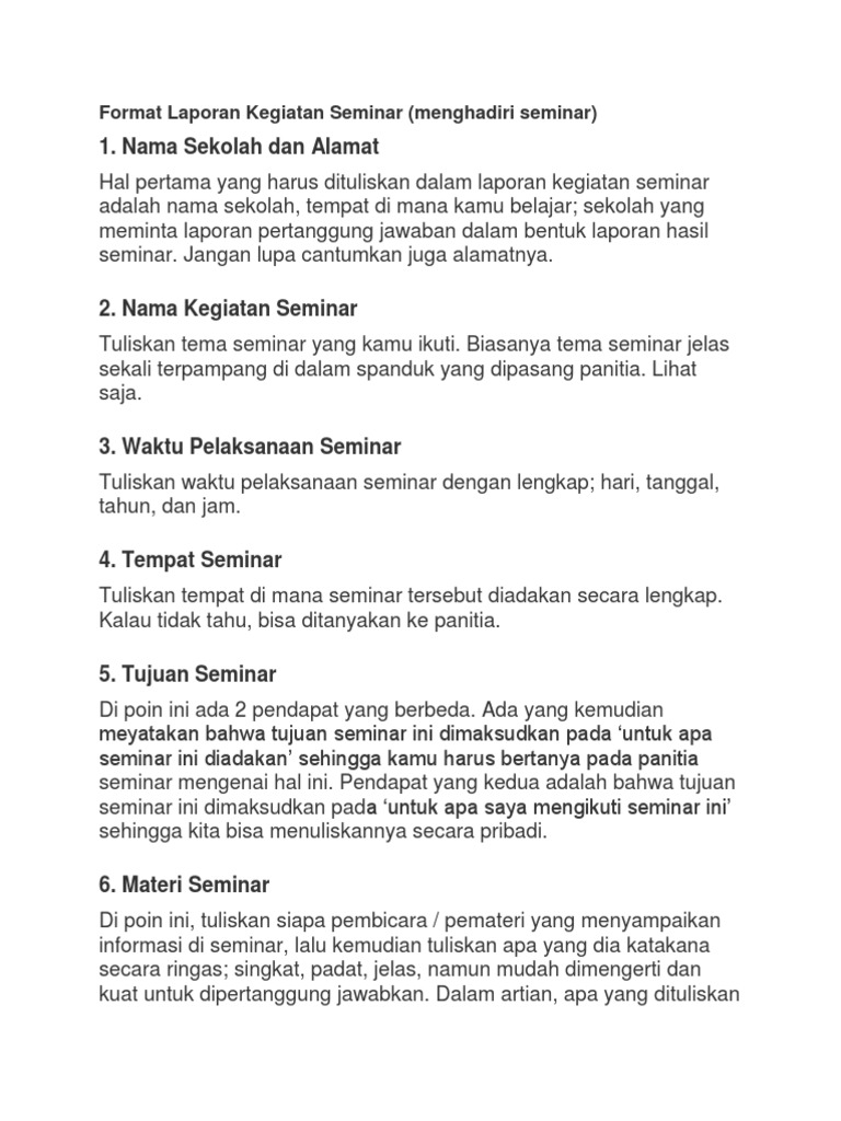 Sintesa Contoh Laporan Kegiatan Seminar 2 Jenis Mengikuti Seminar Mengadakan Seminar Page 1 Created With Publitas Com. Persidangan di sini termasuklah juga Kongres Seminar Forum Simposium Kolokium Wacana Ceramah MesyuaratPerjumpaan dan Bengkel yang tidak bersifat Kursus.